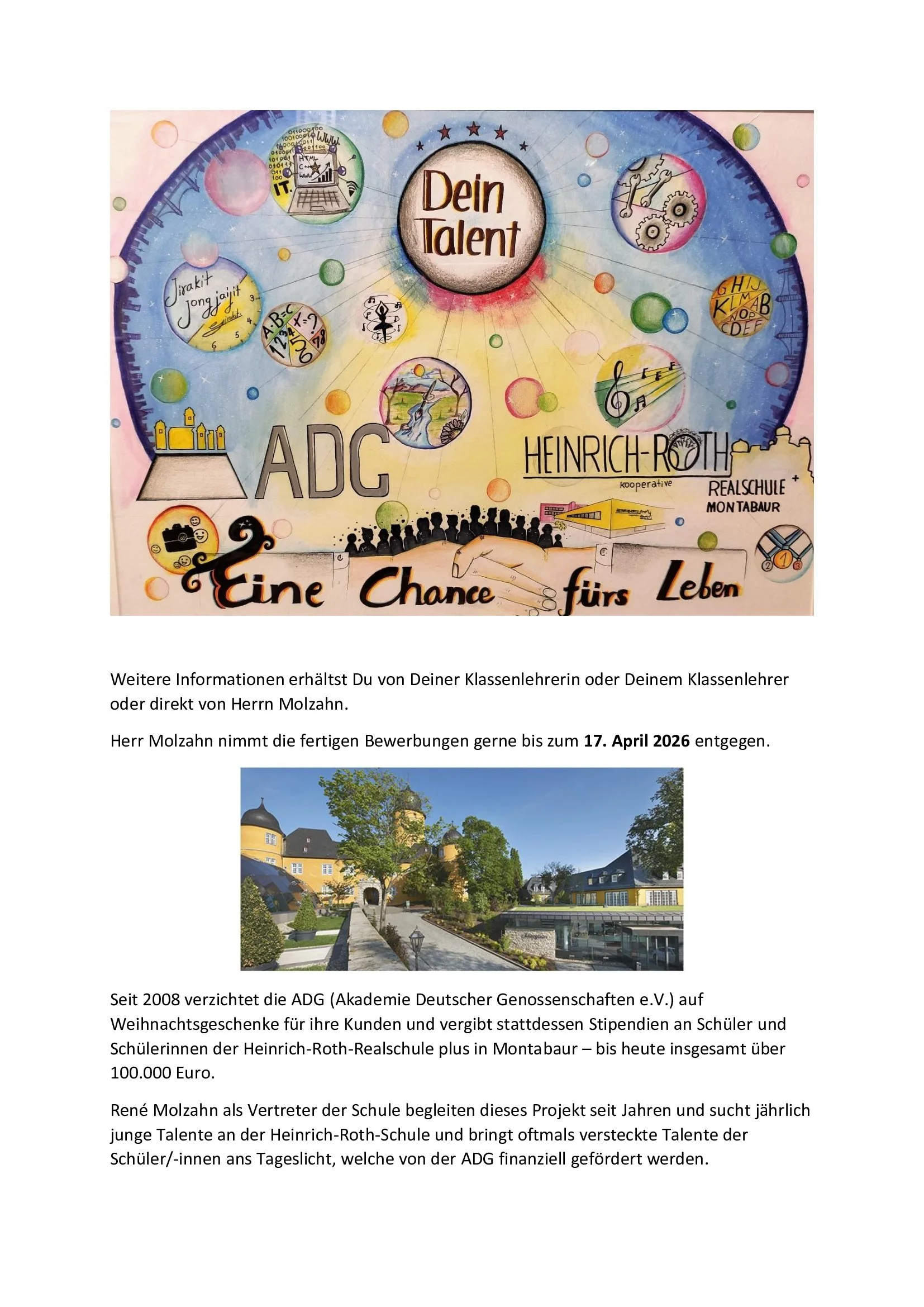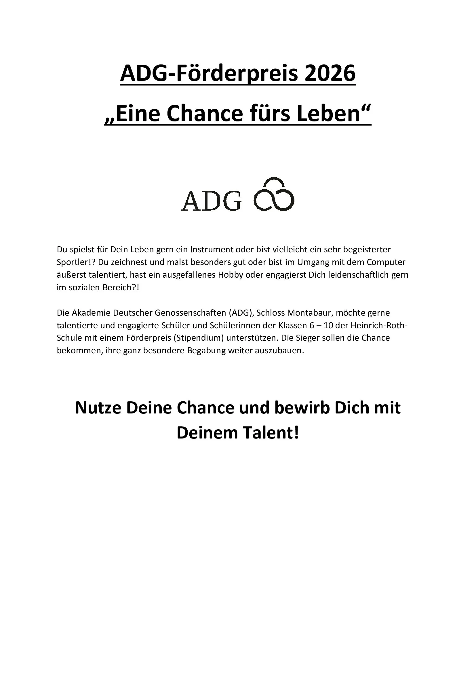 Die ADG verzichtet seit 2008 auf Weihnachtsgeschenke für ihre Kunden und schreibt stattdessen den Förderpreis für die Schüler der Heinrich-Roth-Realschule plus aus. So wurden seit 2008 Stipendien im Gesamtwert von rund 80.000 Euro vergeben.
