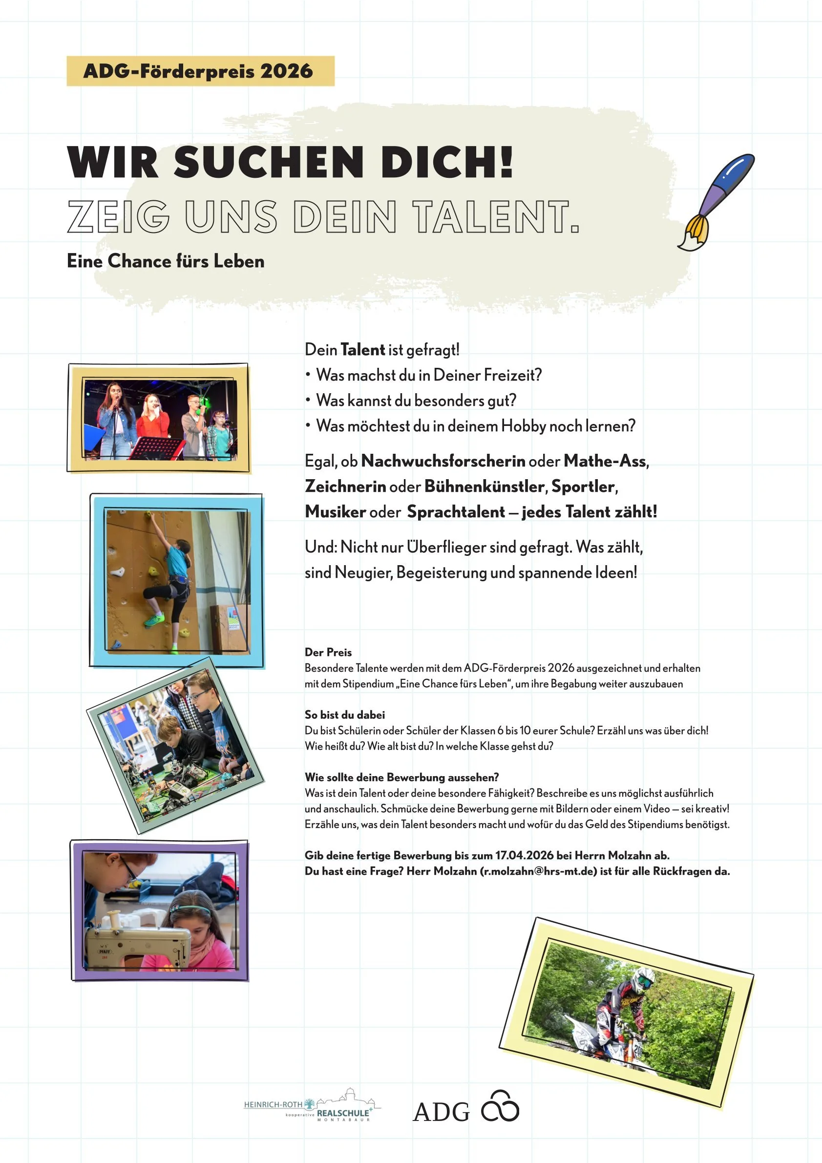 Seit 2008 verzichtet die ADG auf Weihnachtsgeschenke für Kundinnen und Kunden und fördert stattdessen jährlich die Schülerinnen und Schüler der Heinrich-Roth-Realschule plus durch den Förderpreis. Insgesamt wurden seit 2008 Stipendien im Gesamtwert von rund 95.000 Euro an talentierte junge Menschen in verschiedenen Bereichen wie Kunst, Musik, Sport und Naturwissenschaften vergeben.