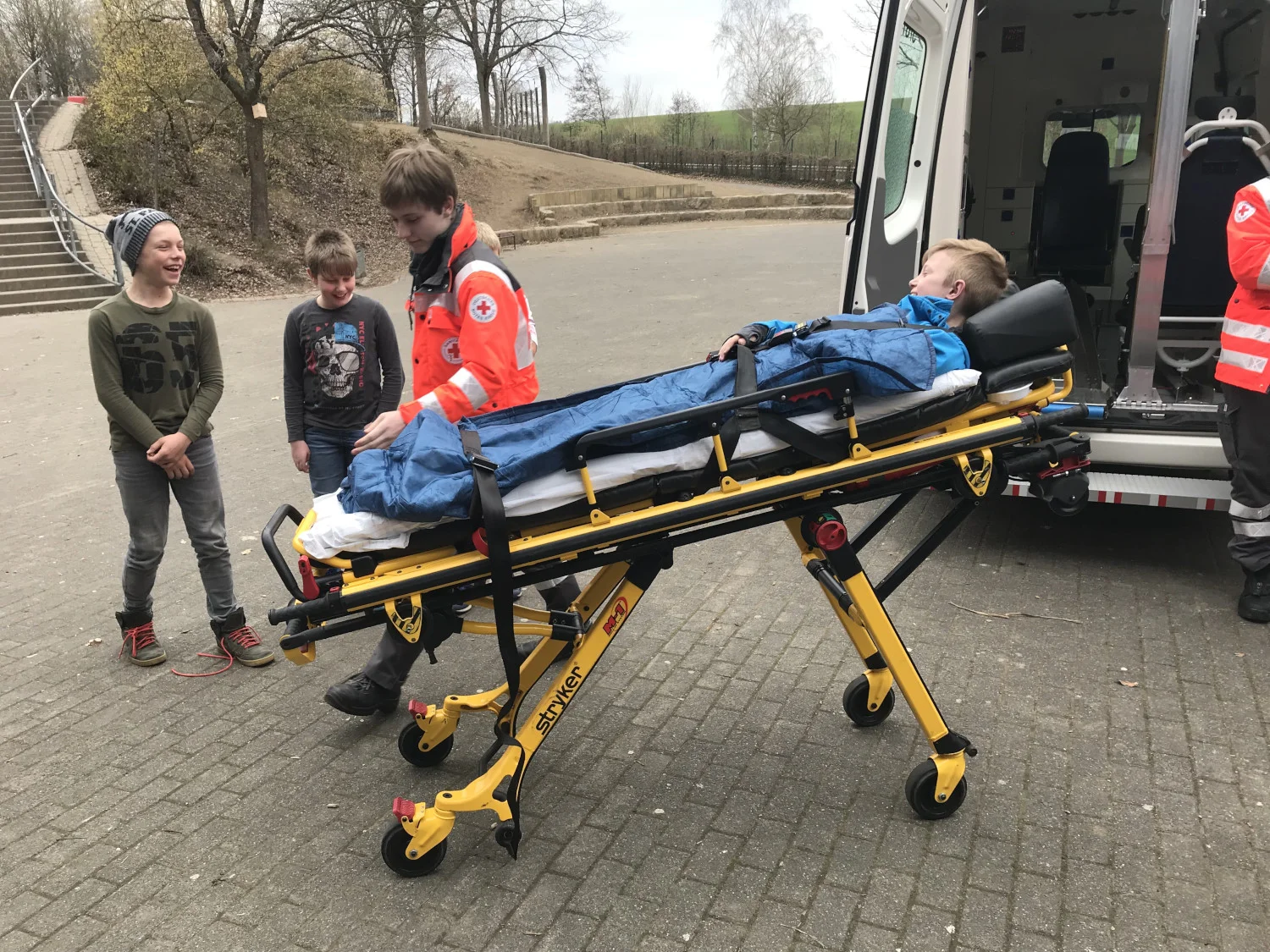 Natürlich durften die Schulsanitäter mithelfen und bekamen somit einen Einblick in den Beruf des Sanitäters. Dabei lernten sie wie man verletzte Leute über eine Trage in den KTW transportiert, wie man die Schaufeltrage zusammen mit der Halskrause anwendet, wie man Patienten mit dem Tragestuhl in den KTW transportiert oder wie man die Lifebase anwendet.