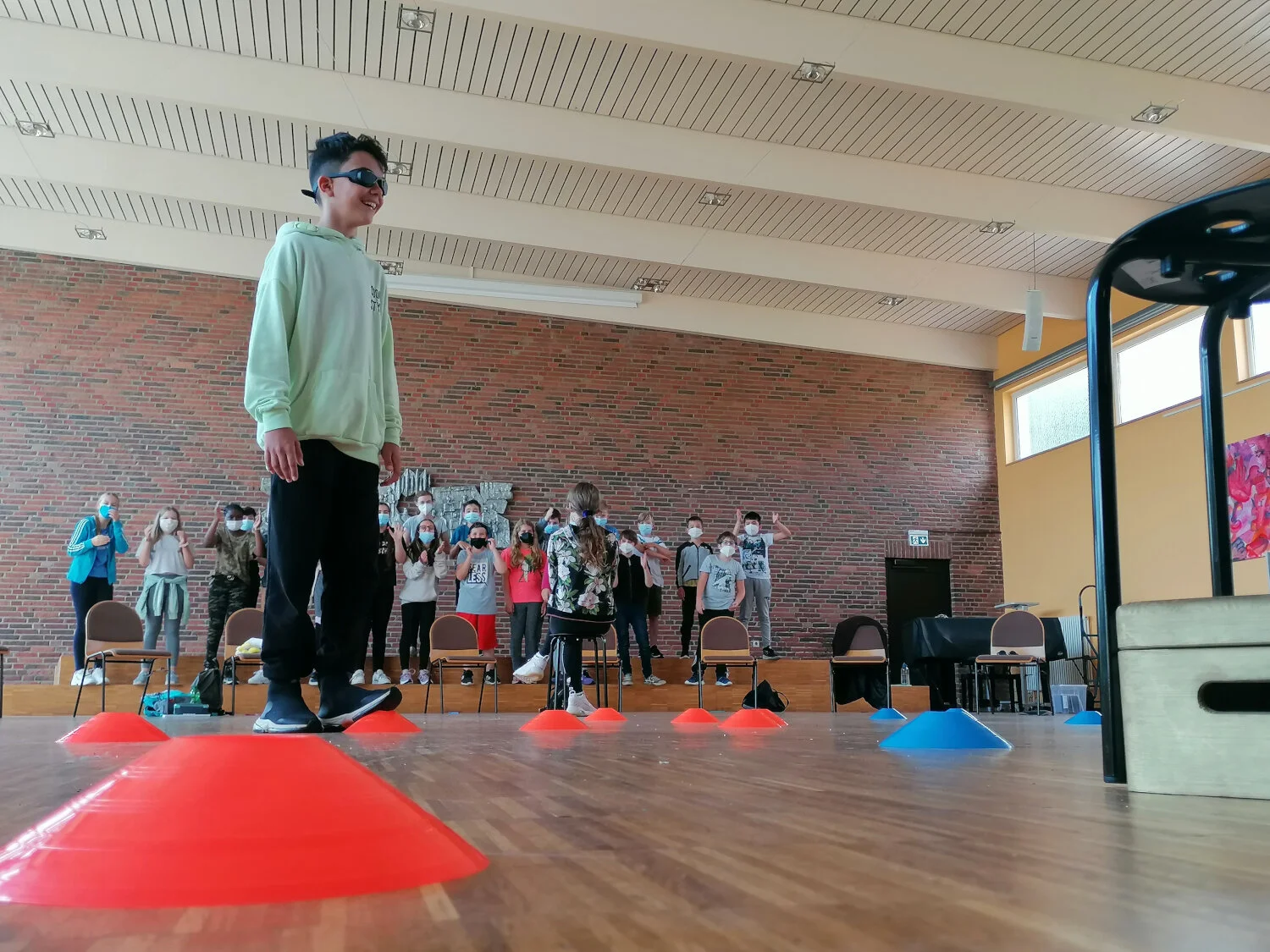 Dort wurde die Gruppe bereits von Johanna Nolte und Sascha Fein von der Katholischen Fachstelle für Jugendarbeit des Bistums Limburg erwartet. Beide hatten für den Orientierungstag der Klasse eine Menge Übungen und Spiele vorbereitet. Und diese Vorbereitung kam sehr gut an: „Können wir das nochmal machen?“ fragten die Kinder nicht nur nach der bereits erwähnten Übung „Astronaut“, sondern auch beim Ampelspiel und beim Kissenrennen. So verging der Vormittag wie im Flug und die Schüler*innen hatten sich die Pizzen, die für die Mittagspause bestellt wurden, redlich verdient. Die Klasse konnte frisch gestärkt den zweiten Teil des Orientierungstages angehen.