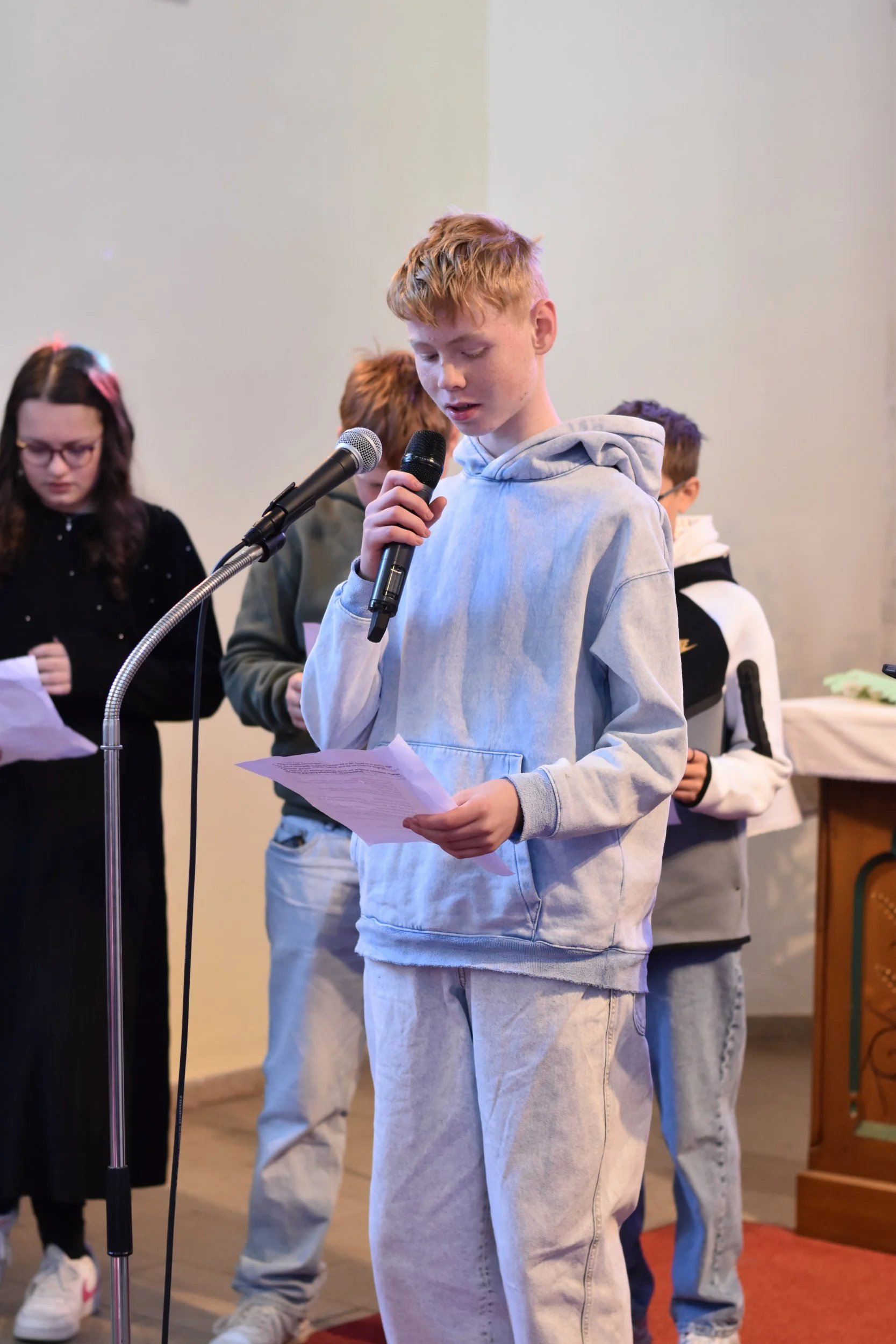 Lehrkräfte und SchülerInnen machten sich gemeinsam auf den Weg zur evangelischen Pauluskirche, wo sie von Pfarrerin Bosse erwartet wurden. Diese freute sich sehr über die Vielzahl der Kinder, besonders aber darüber, dass nicht nur katholische und evangelische SchülerInnen zum Gottesdienst gekommen waren. Ein Großteil der Kinder, die in der Schule eigentlich den Ethikunterricht besuchen, darunter auch viele Muslime, hatten sich gemeinsam mit ihren Klassenkameradinnen und Klassenkameraden aufgemacht um am Schulgottesdienst teilzunehmen.